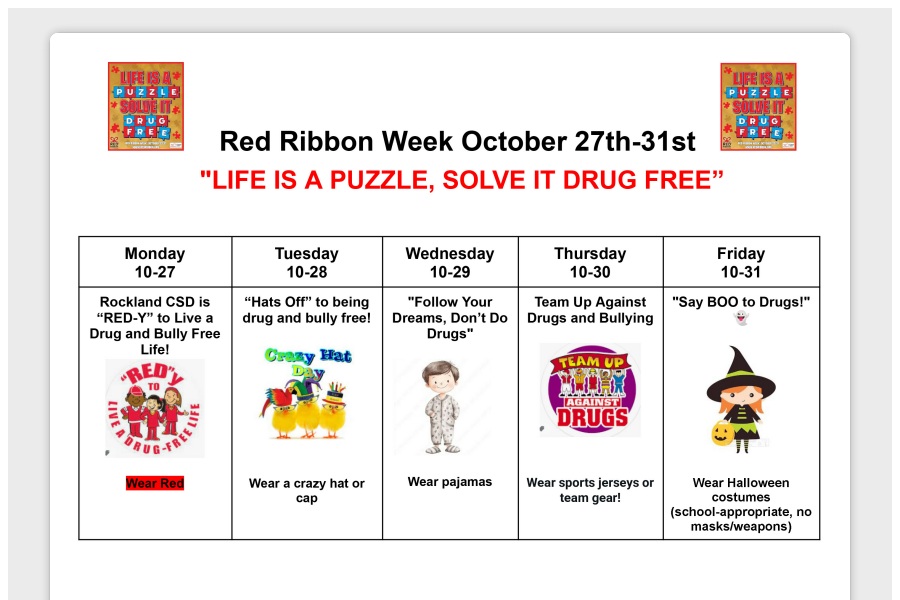 RES to celebrate Red Ribbon Week Rockland Elementary School will celebrate Red Ribbon Week with dress up days Oct. 2731. The effort encourages students to be drug free as well as promotes an a. . .